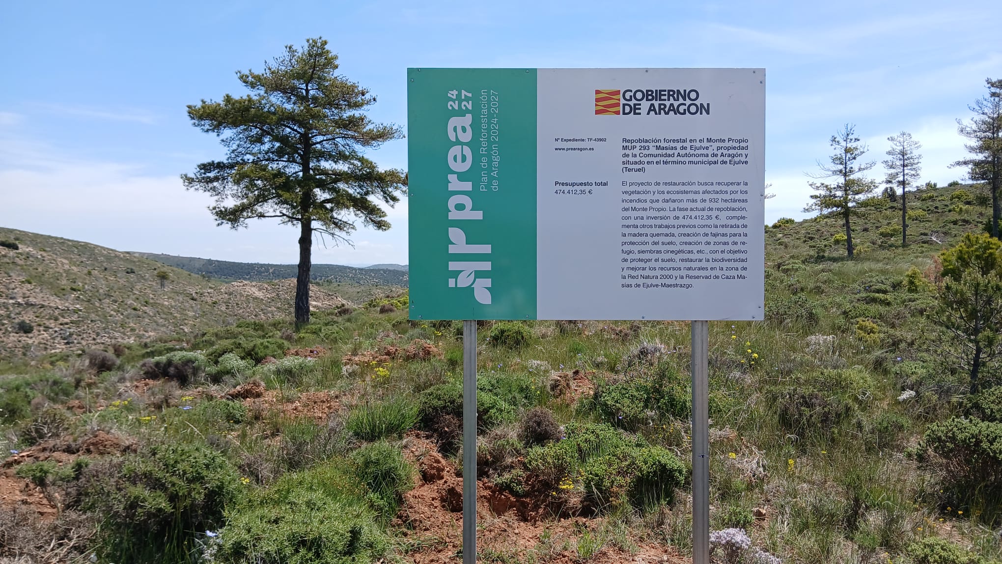 El PREA también contempla la recuperación de zonas afectadas por grandes incendios forestales. Los trabajos en Ejulve son un ejemplo significativo. Esta zona fue devastada por un incendio en 2009, que quemó cerca de 8.000 hectáreas, y sufrió otro gran incendio años más tarde. Actualmente, se está actuando en un monte de titularidad autonómica, donde se repoblarán 87 hectáreas con especies autóctonas adaptadas al terreno. Ya se han plantado seis hectáreas. La inversión prevista es de 474.412,35 euros.
