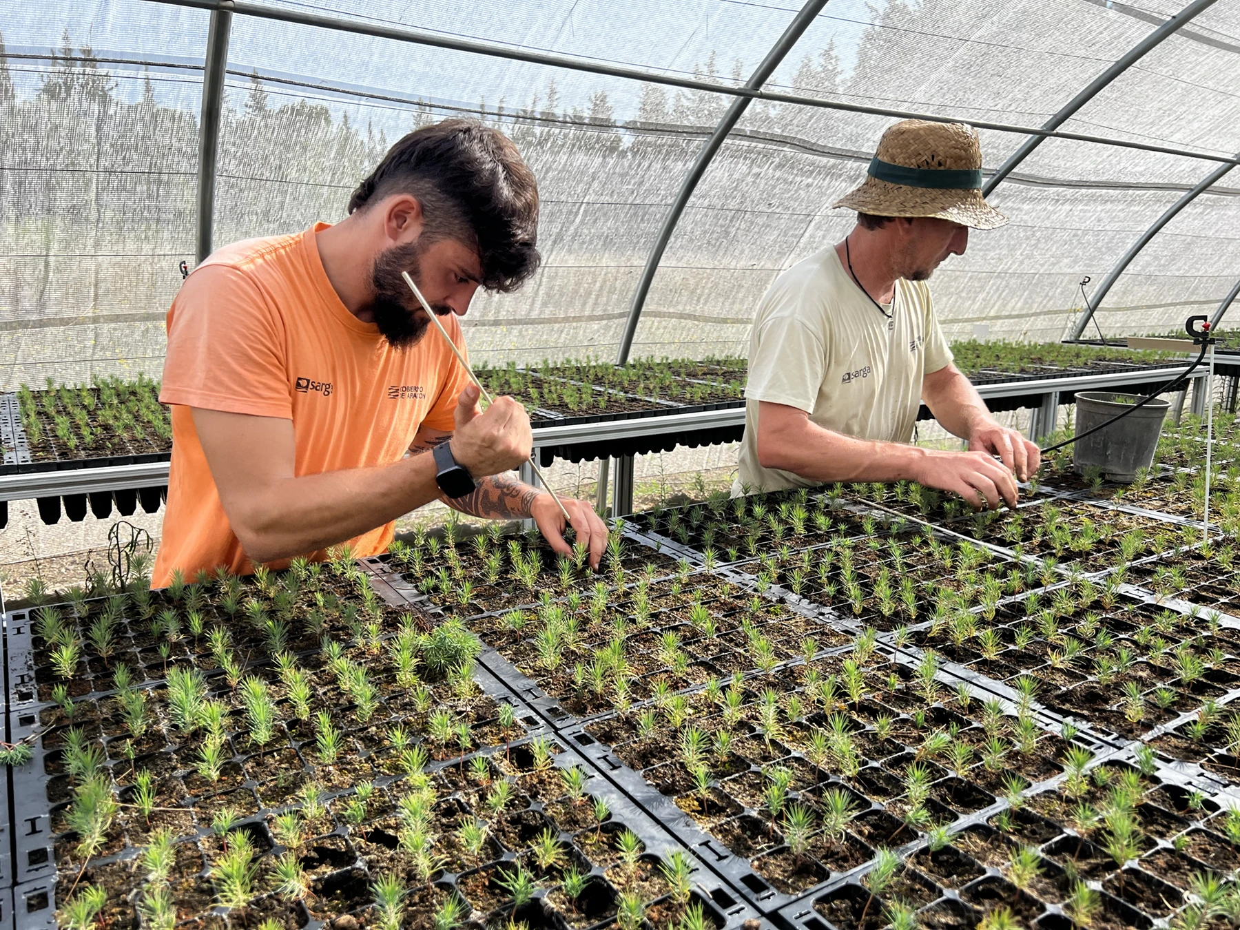 Toda la planta se cultiva en contenedor forestal de 200 cm³ en túneles de sombreado del 70%, y el proceso es íntegramente manual: desde la preparación del sustrato —una mezcla de turba, arena local y elementos inertes— hasta el semillado, selección de plántulas, riego y fertilización.